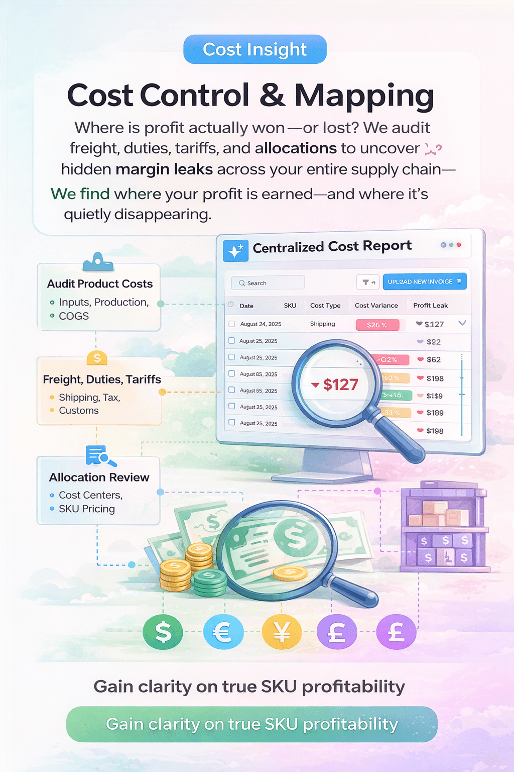 Where is profit actually won—or lost? We audit product costs, freight, duties, tariffs, and allocations to uncover hidden margin leaks and cost variances across your entire supply chain—so you know exactly where profits are earned and where they’re quietly disappearing. If you want a shorter or more marketing-led version, I can provide that as well.